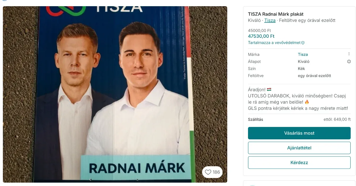 A jelentések után átkutattuk a Vinted platformot, ahol találtunk egy Radnai Márk–Magyar Péter közös plakátot 30 ezer forintos áron. Míg ezek az árak első pillantásra sokkolónak tűnnek, a hirdetések úgy tűnik, gyorsan eltűntek a piacról, ami arra utal, hogy a kampánykellékek iránti kereslet magas.